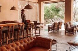 Le bar, le salon et la salle à manger sont ouverts sur l’extérieur face au petit point d’eau où viennent se rafraîchir les animaux sauvages.