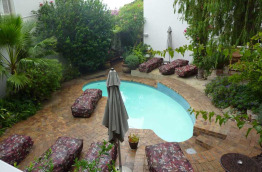 Mais le véritable cœur de la maison se situe sur le balcon couvert où sont servis les petit-déjeuners ainsi que le thé de 16h, surplombant une jolie petite piscine entourée de végétation tropicale.