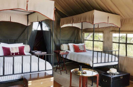 Les 12 tentes traditionnelles de type meru tent sont meublées avec de beaux meubles anciens en bois, 6 twins avec lits simples ou et 4 doubles avec un grand lit, salle de bain attenante avec douche à ciel ouvert.