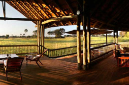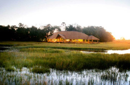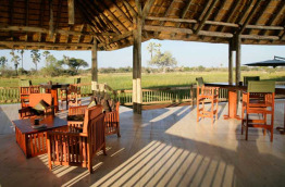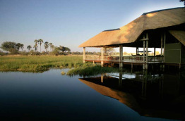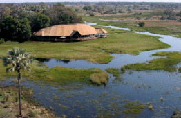 Le camp est construit sur pilotis au sein des eaux permanentes et les différents bâtiments sont reliés entre eux par des passerelles en bois. Les parties communes sont réunies sous un vaste bâtiment au toit de chaume arrondi qui lui donne un air d’arche de Noé, face à la lagune. Un vaste salon ouvert, avec de confortables fauteuils, se prolonge par une terrasse accueillant le coin feu. La salle à manger et le bar sont également entièrement ouverts sur le delta.