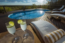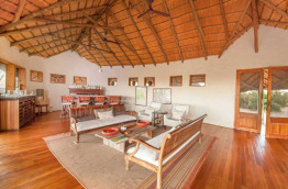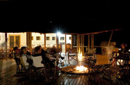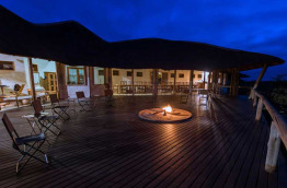 Un vaste bâtiment largement ouvert vers l’extérieur accueille les parties communes : bar, coin salon avec de confortables fauteuils, salle à manger et grande terrasse avec coin feu et piscine. La vue est extraordinaire et un télescope permet de surveiller l’activité des animaux sur le pan, tandis que le point d’eau, en contre-bas, attire souvent les lions.