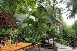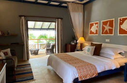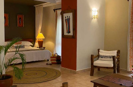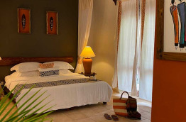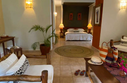 Les 12 Deluxe Garden Suites mesurent 90 m2. Vous bénéficiez d’un grand salon avec fauteuils, chaises et table à manger, le tout ouvert sur une terrasse privée. La chambre offre une décoration avec des masques et des œuvres d’art locales.