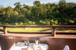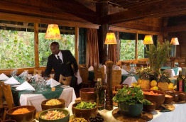 Les repas sont servis sous forme de buffet dans le restaurant panoramique qui surplombe le point d’eau et la forêt environnante.
