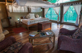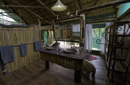 Les parties communes sont disséminées en petites unités le long de la rivière, reliées par des passerelles en bois : le restaurant excentré près de la piscine, le bar à côté du coin feu du soir et le salon sur pilotis qui est un parfait poste d’observation des animaux.