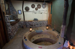 - 1 Honeymoon Tent qui dispose d’une superbe terrasse avec possibilité d’ouvrir entièrement un pan de mur, d’un lit double, et d’une salle de bains avec une baignoire creusée dans le sol et une douche extérieure.