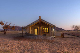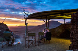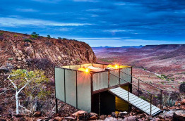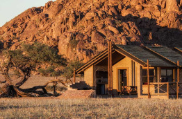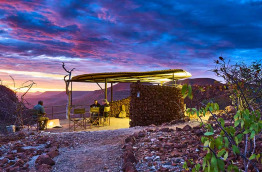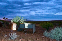 Nuit au Etendeka Mountain Camp (tente safari avec lits de camp). Ce camp de toile simple proche de la nature jouit d’une situation privilégiée ; niché sur la montagne Crystal, il offre une vue extraordinaire sur la vallée.