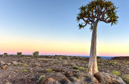 Départ vers la ville de Keetmanshoop, la porte sur le Grand Sud namibien. À 13 km au Nord de la ville, la Quiver Tree Forest se trouve sur les terres privées d’une ferme. L’arbre à carquois des San, appelé Quiver tree en anglais et Kokerboom en Afrikaans, est une variété de plante aloès endémique de Namibie. On compte environ 250 arbres sur la propriété qui ont tous entre 200 et 300 ans. Ils peuvent atteindre jusqu’à 9 m de hauteur et sont très résistants à la sécheresse. Ils se parent de magnifiques fleurs de couleur jaune de juin à juillet, créant un décor féerique où déambulent d’innombrables damans qui y ont élu domicile.