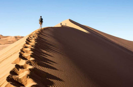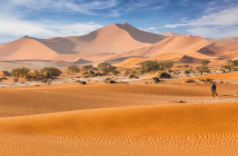 Départ matinal à la découverte des dunes de Sossusvlei pouvant atteindre jusqu’à 300 m de hauteur. Le lever du soleil est l’occasion idéale pour admirer les différentes teintes de rouge, orange et rose que revêt le paysage. Un magnifique jeu d’ombres et de lumières. La Dune 45, la plus célèbre, est facilement accessible et offre à son sommet une vue magnifique sur la vallée. Au milieu des dunes, la rivière Tsauchab désormais asséchée forme un désert de sel et d’argile. Vous y croiserez quelques espèces végétales et animales qui ont su s’adapter au climat sec et aride. En observant le sable, vous remarquerez des traces laissées par des geckos ou des petites araignées. Les plus chanceux verront peut-être des autruches, antilopes ou renards. Vous continuerez ensuite vers le Deadvlei, un désert de sel dans lequel se dressent des arbres qui, même morts, ne se décomposent pas. Cette ancienne oasis, autrefois parsemée d'acacias, a séché en gardant avec elle ces arbres assoiffés. 900 ans plus tard, on y retrouve encore des troncs desséchés et noircis, entourés par les dunes et créant un spectacle totalement surréaliste.