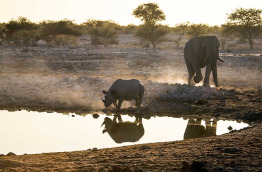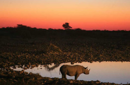 Dîner et nuit au Etosha Trading Post ou Okaukuejo Restcamp. Le point fort de ce camp est son point d’eau éclairé, célèbre pour les scènes animalières que l’on peut y observer. Le rhinocéros noir, le lion et l’éléphant viennent souvent s’abreuver au coucher du soleil et à la tombée de la nuit.