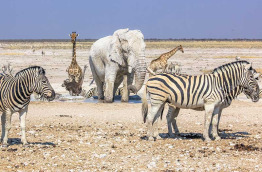 À votre arrivée en fin d’après-midi, vous partirez pour un premier safari. Etosha abrite pas moins de 114 espèces de mammifères, et la majorité des Big Five. Il y est très facile d’observer des éléphants et des lions. Il abrite aussi une grande population de rhinocéros noirs, une espèce en voie d’extinction qu’on retrouve le plus souvent autour des points d’eau du parc. Des léopards peuvent être aperçus, cachés à l’ombre des arbres. Vous y rencontrerez aussi zèbres, guépards, girafes, hyènes et plusieurs espèces d’antilopes.