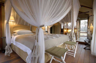 Les 8 tentes sont disséminées dans le bush et entourées de végétation pour une intimité parfaite. La chambre, avec lit double ou 2 lits simples, est séparée de la terrasse par une immense baie vitrée. le plancher est en bois exotique et la décoration très chic, dans les tons beiges. La salle de bains, avec w.-c. séparés, peut être ouverte en roulant un pan de toile afin de créer une douche extérieure. Chaque tente est équipée de l'air conditionné, de moustiquaires, d'un téléphone, d'un minibar et d'un nécessaire à thé et café.