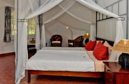 Les 9 chambres, dont 2 familiales, sont construites sous forme de chalets indépendants, vastes, avec lits doubles ou jumeaux, salle de bains privative et terrasse.